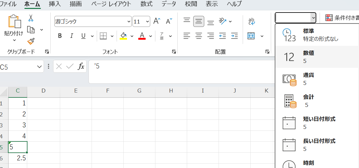 ⑤「文字列」になっている場合は「標準」または「数値」に変更してEnterキーで再確定する
