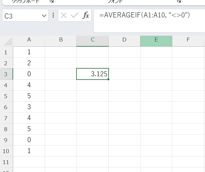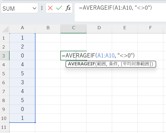 データに0が含まれていて、0を除いた値だけで平均を求めたい場合はAVERAGEIF関数を使いましょう。