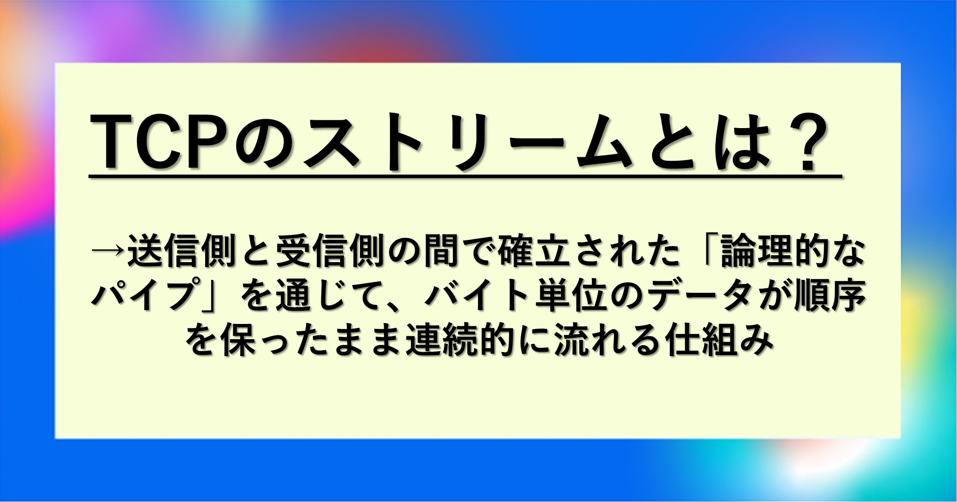 TCPストリームでは、アプリケーションが送信するデータは「連続したバイト列」として扱われます。これは、受信側のアプリケーションが任意のタイミングで任意のサイズだけデータを読み取れることを意味するでしょう。